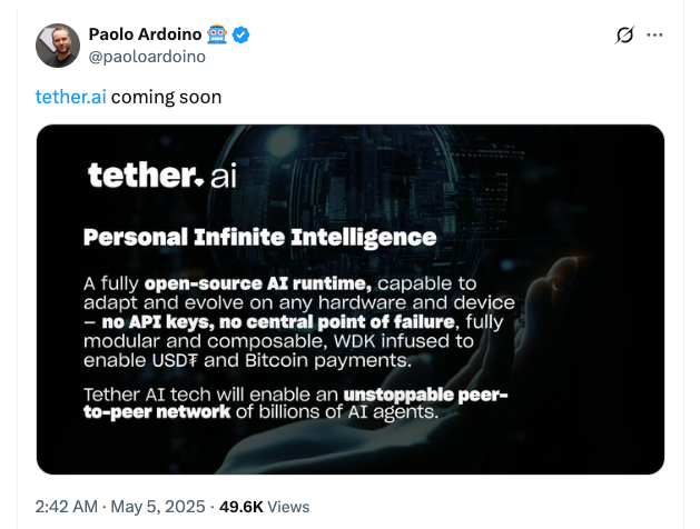 پائولو آردوئینو (Paolo Adroino) – مدیرعامل تتر – روز ۵ می (۱۵ اردیبهشت) توییتی منتشر و از نزدیک بودن زمان راهاندازی پلتفرم Tether AI خبر داد؛ پلتفرمی که به گفته او قرار است نوعی «هوش بینهایت شخصی» به کاربران ارائه دهد. او توضیح داد که این پلتفرم بهصورت داخلی از پرداختهای همتابههمتا (P2P) با بیت کوین و USDT پشتیبانی میکند و به کاربران امکان میدهد بدون واسطه و مستقیم تراکنش انجام دهند.