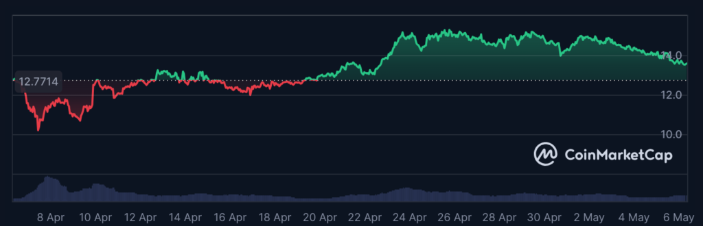 قیمت خرید لینک در طول ۲۴ ساعت گذشته ۲.۷۷٪ کاهش یافته، در طول ماه گذشته ۶.۷٪ رشد کرده و در زمان نگارش مطلب به ۱۳.۶۱ دلار رسیده است. این آلت کوین همچنان ۷۴٪ پایینتر از اوج تاریخی خود در ۵۲.۷ دلار (که در ماه می ۲۰۲۱ به آن رسیده بود) معامله میشود.