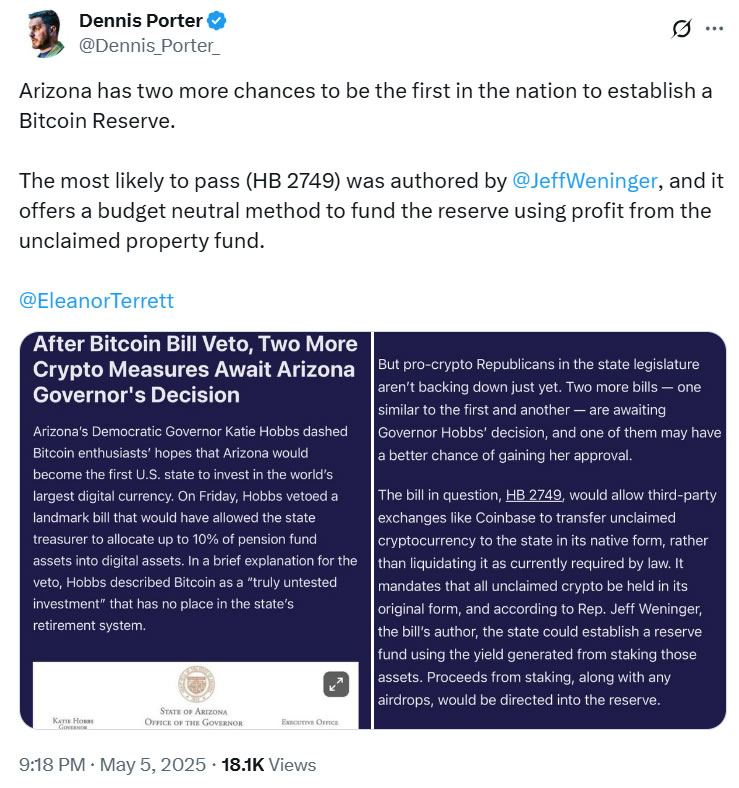 پورتر توضیح داد که لایحه هاوس بیل HB 2749 شانس بیشتری برای تصویب دارد؛ چرا که شیوهای بودجهخنثی پیشنهاد کرده و ذخیره بیت کوین از محل سود حاصل از وجوه اموال بلاصاحب تامین میشود.