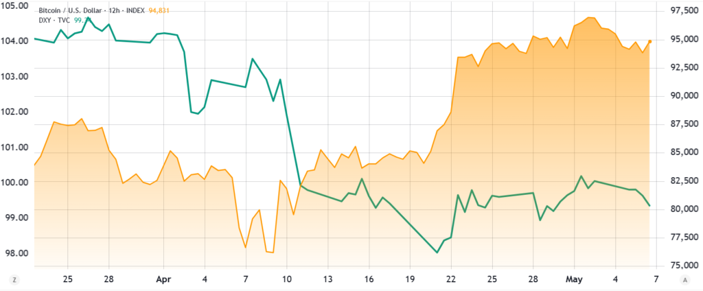 شاخص دلار آمریکا (DXY) برای نخستین بار از جولای ۲۰۲۳ (تیر ۱۴۰۲) به زیر سطح ۱۰۰ سقوط کرده است، زیرا سرمایهگذاران بهدلیل شرایط نامطمئن اقتصادی از بازارهای آمریکا خارج میشوند. همزمان، قیمت طلا طی ۳۰ روز گذشته بیش از ۱۲٪ افزایش یافته و اکنون تنها ۲٪ با رکورد تاریخی ۳٬۵۰۰ دلار فاصله دارد. کاهش اعتماد به توانایی وزارت خزانهداری آمریکا در تأمین مالی بدهیهای خود، موجب گرایش سرمایهگذاران بهسوی داراییهای کمیاب و ذخیره ارزش همچون بیت کوین شده است.