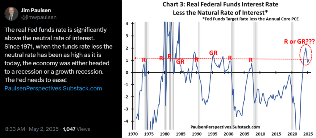 جیم پالسن (Jim Paulsen)، اقتصاددان و سرمایهگذار، خاطرنشان میکند که زمانی که نرخ بهره فدرال بالاتر از نرخ «خنثی» قرار میگیرد (یعنی نرخ بهره فدرال منهای شاخص سالانه مخارج مصرف شخصی هستهای)، اقتصاد آمریکا بهطور تاریخی بهسمت رکود یا «رکود رشد» حرکت کرده است؛ دورهای که با رشد ضعیف اقتصادی، افزایش نرخ بیکاری و کاهش تقاضای مصرفکننده همراه است. الگوهای مشابه از سال ۱۹۷۱ تاکنون از این تحلیل پشتیبانی میکنند.