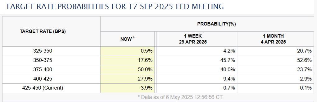 با این حال، انتظارات بازار ـ بر اساس قراردادهای آتی بازدهی اوراق خزانهداری ـ نشان میدهد که تا تاریخ ۱۷ سپتامبر (۲۶ شهریور)، احتمال ۷۶٪ وجود دارد که نرخ بهره به ۴.۰٪ یا کمتر کاهش یابد. این احتمال نسبت به ۹۰٪ در تاریخ ۲۹ آوریل کاهش قابل توجهی یافته است.