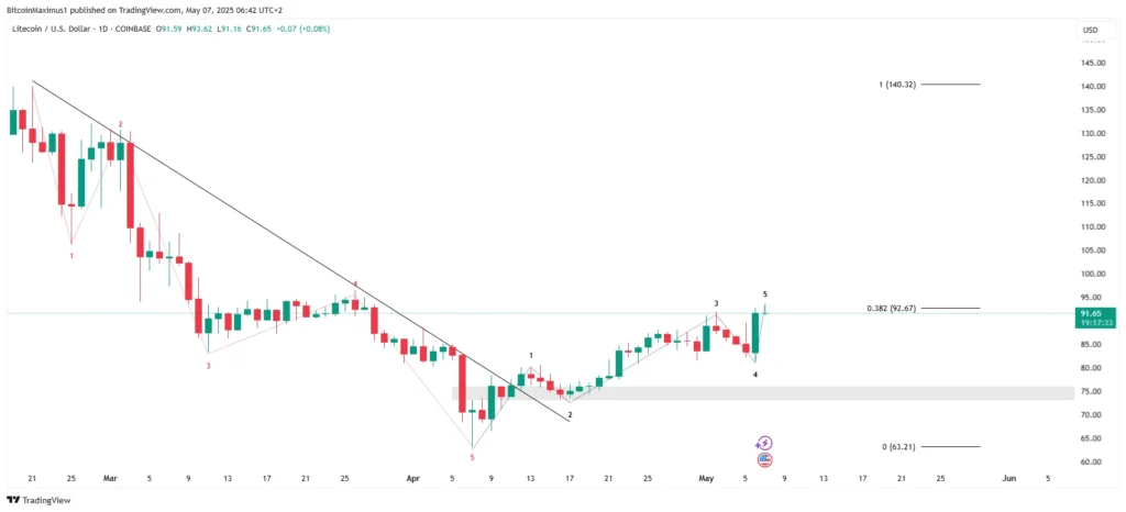 الگوی موجی در ایم فریم روزانه نشان میدهد احتمالاً به سقف محلی رسیدهایم. طبق این الگو، لایت کوین یک الگوی پنج موجی نزولی بلندمدت (رنگ قرمز) را تکمیل کرده که نشان میدهد اصلاح به پایان رسیده است. این شکست، با شکست خط روند نزولی و شروع یک روند صعودی سریعتر تایید شده است.