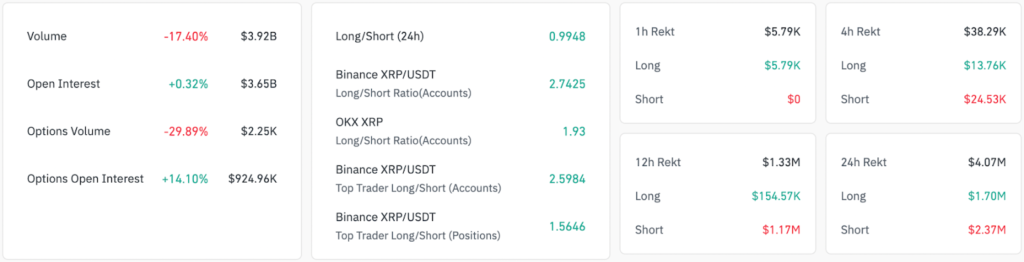 در همین حال، میزان سود باز ریپل در طول ۲۴ ساعت گذشته ۰.۳۲٪ افزایش یافته و به ۳.۶۵ میلیارد دلار رسیده که حاکی از رشد اندک اعتماد معاملهگران و نقدینگی است. با این حال، کاهش ۱۷٪ حجم معاملات به ۳.۹ میلیارد دلار، میتواند نشانهای از تردید بازار و عدم اطمینان درباره جهتگیری آینده قیمت باشد.