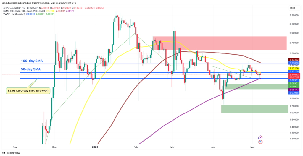 دادهها نشان میدهد که قیمت ریپل در تاریخ ۶ می (۱۶ اردیبهشت) از میانگین متحرک ساده ۲۰۰ روزه (SMA) در سطح ۲.۰۸ دلار جهش کرده و تا سقف روزانه ۲.۱۷ دلار (که همتراز با میانگین متحرک ۵۰ روزه نیز هست) رشد کرده است.
