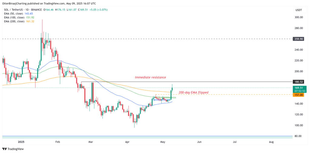 نمودار روزانه نیز این چشمانداز را تایید میکند. سولانا اخیراً بالاتر از میانگین متحرک نمایی ۲۰۰ روزه بسته شده و اولین مقاومت پیش رو در محدوده ۱۸۰ دلار قرار دارد. اگر در هفتههای آینده این سطح شکسته و به حمایت تبدیل شود، ممکن است در سهماهه سوم سال ۲۰۲۵ شاهد یک رشد انفجاری باشیم.