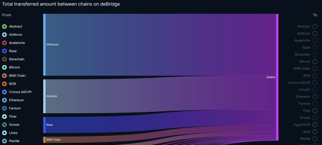 در طول ۳۰ روز گذشته، بیش از ۱۶۵ میلیون دلار نقدینگی از سایر بلاکچینها به سولانا منتقل شده که نشاندهنده افزایش اعتماد به این شبکه است. طبق دادههای پلتفرم Debridge، اتریوم با ۸۰.۴ میلیون دلار در صدر قرار داشته و پس از آن آربیتروم با ۳۳ میلیون دلار در رتبه دوم است. همچنین بیس (Base)، بیانبی و سونیک به ترتیب ۲۰، ۸ و ۶ میلیون دلار نقدینگی به سولانا وارد کردهاند.