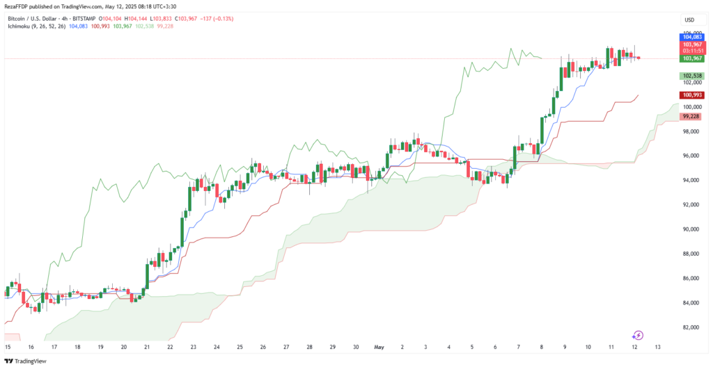 در تایم فریم چهارساعته، نمودار بیت کوین نشان میدهد که روند کلی بازار همچنان صعودی است. قیمت بالای ابر کومو قرار دارد و شیب ابر آینده نیز صعودی است که نشاندهنده قدرت روند مثبت در میانمدت است. خط تنکانسن (آبی رنگ) بالای کیجونسن (قرمز رنگ) قرار دارد و این فاصله، نشان از تسلط خریداران دارد.