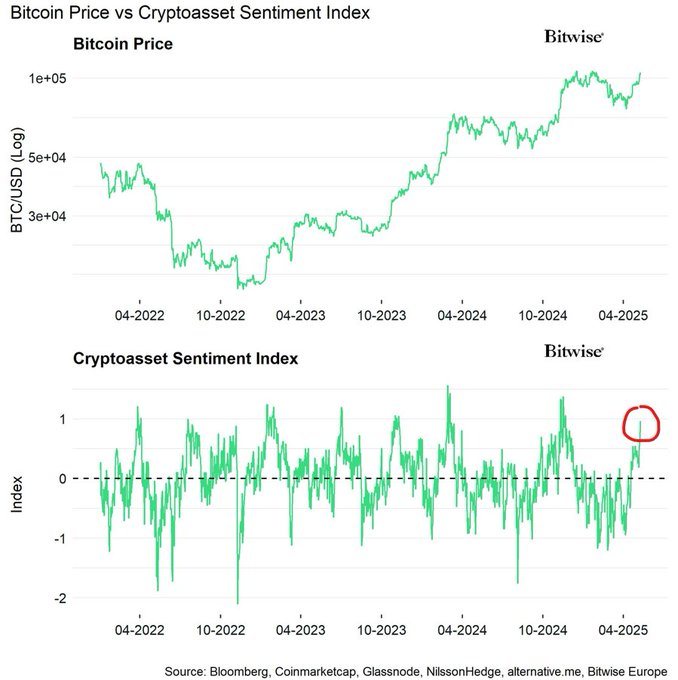 آندره دراگوش (André Dragosch)، رئیس بخش تحقیقات بیت وایز (Bitwise)، هشدار داده که بیت کوین ممکن است کمی جلوتر از واقعیتهای بازار حرکت کرده باشد. او در یادداشتی اعلام کرد شاخص احساسات بازار رمزارزها که توسط این شرکت به صورت داخلی تهیه میشود، به بالاترین سطح خود از نوامبر ۲۰۲۴ رسیده است. این شاخص که شامل ۱۵ زیرشاخص مختلف در حوزه احساسات بازار، جریان سرمایه، دادههای آنچین و مشتقات (نظیر نرخ سرمایهگذاری دائمی و نسبت حجم قراردادهای خرید به فروش) است، اکنون شرایط یک بازار داغ و اشباعشده را نشان میدهد.