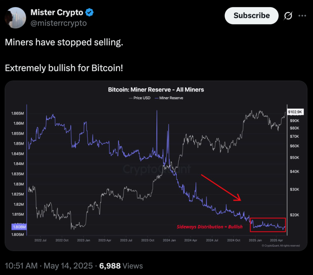 پیشتر نیز گزارش داده بودیم که کاهش فشار فروش از سوی ماینرها، به روند صعودی قیمت کمک کرده، بهویژه در شرایطی که حجم خرید سازمانی از مقدار بیت کوین استخراجشده در روز بسیار فراتر رفته است.