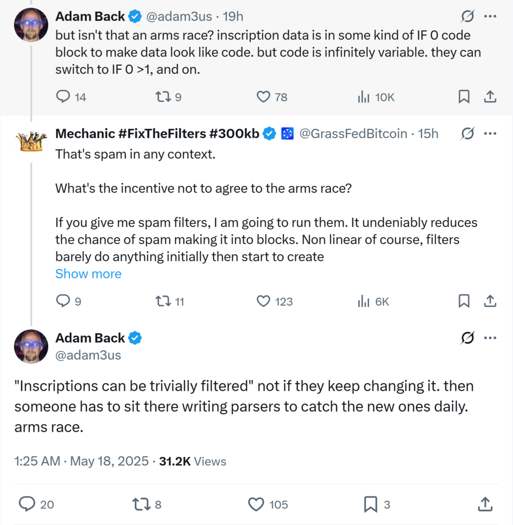 به باور او، مقابله با اسپم نوعی سانسور محسوب نمیشود، چراکه نودهای بیت کوین هماکنون نیز بسیاری از تراکنشهای نامعتبر را رد میکنند.