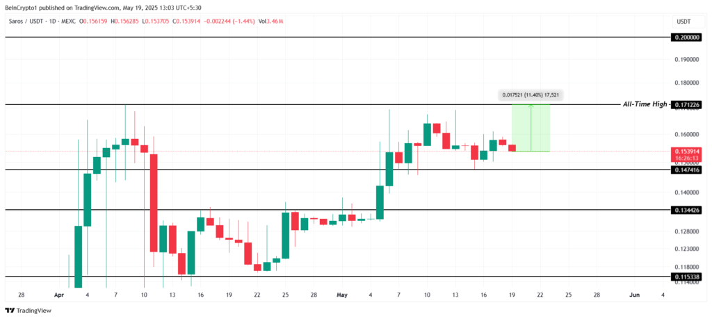 قیمت ساروس (SAROS) در ماه آپریل به سقف تاریخی خود (یعنی ۰.۱۷۱ دلار) رسید. این ارز دیجیتال در زمان نگارش مطلب با قیمت ۰.۱۵۴ دلار معامله میشود و همچنان بالای سطح حمایتی ۰.۱۴۷ دلار باقی مانده است. قیمت ساروس تنها ۱۱٪ با سقف تاریخی خود فاصله دارد که نشان میدهد اگر شرایط بازار صعودی باقی بماند، احتمال رشدش بالاست.