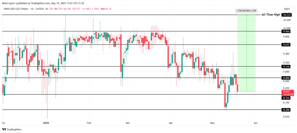 توکن LEO باید حدوداً ۲۰٪ رشد کند تا به رکورد پیشین خود برسد، اما این کار آسانی نیست. بزرگترین رشد روزانه این توکن در سال جاری تنها ۴.۴۷٪ بوده است. با این حال، اگر قیمت بیت کوین بتواند از سطح ۱۱۰,۰۰۰ دلار عبور کرده و قیمت لئو هم سطح ۹.۱۱ دلار را به حمایت تبدیل کند، ممکن است روند صعودی تازهای آغاز شود.