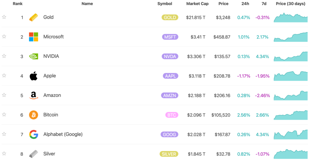 روند تغییرات قیمت بیت کوین در هفتههای اخیر بسیار قدرتمند بوده و در ۲۴ ساعت گذشته نیز این ارز دیجیتال با رشدی تقریبا یک درصدی به کانال ۱۰۴ هزار دلاری بازگشته است. این در حالی است که برخی از داراییهای سنتی حاضر در لیست ارزشمندترین داراییهای جهان، مثل شرکت اپل، آمازون و نقره به ترتیب با ۱.۹۵٪، ۲.۴۶٪ و ۱.۱۰٪ ریزش همراه بودهاند.