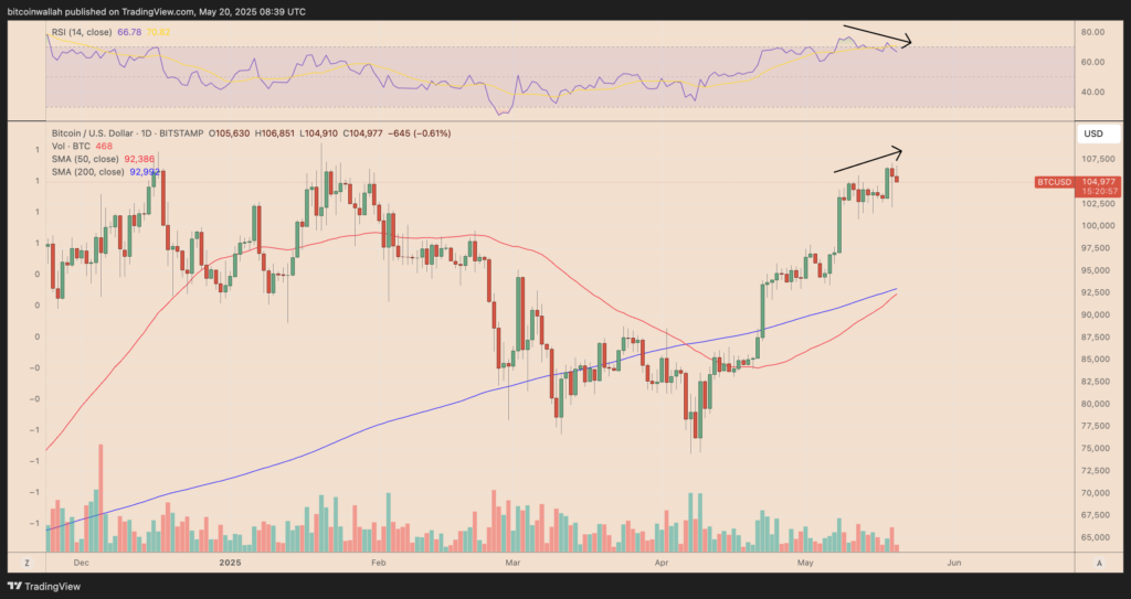 نکته مهم دیگر واگرایی منفی بین قیمت بیت کوین و شاخص RSI است که معمولا نشانهای از کاهش قدرت صعودی و احتمال اصلاح در کوتاهمدت است و باید به آن توجه کرد.