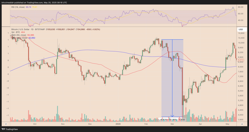 اما آیا گلدن کراس یا همان تقاطع صعودی لزوما همیشه نشانه صعود است؟ پاسخ منفی است. اگرچه این الگو در گذشته بارها با رشد قیمت همراه بوده اما هیچگاه جهش قیمتی پس از آن قطعی نیست. به عنوان مثال در فوریه ۲۰۲۰ الگوی مشابهی در نمودار بیت کوین تشکیل شده بود اما بلافاصله پس از آن، با شروع بحران جهانی کرونا بازارها فرو ریختند و قیمت بیت کوین ۶۲٪ سقوط کرد.