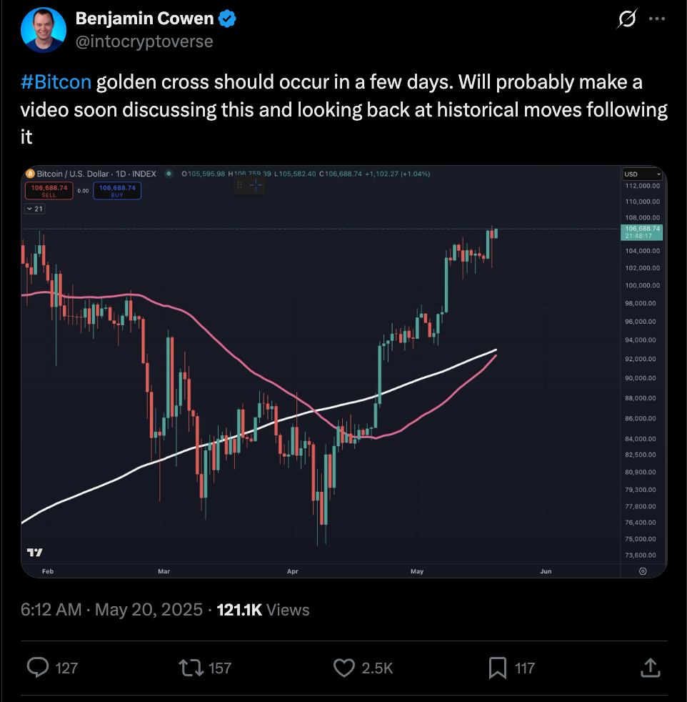 در حال حاضر میانگین متحرک ساده ۵۰ روزه بیت کوین در آستانه عبور از همتای ۲۰۰ روزه خود قرار دارد. این نخستین بار است که از اکتبر ۲۰۲۴ چنین الگویی دیده میشود و به عقیده برخی از تحلیلگران ممکن است با رکوردشکنی بیت کوین همراه شود.