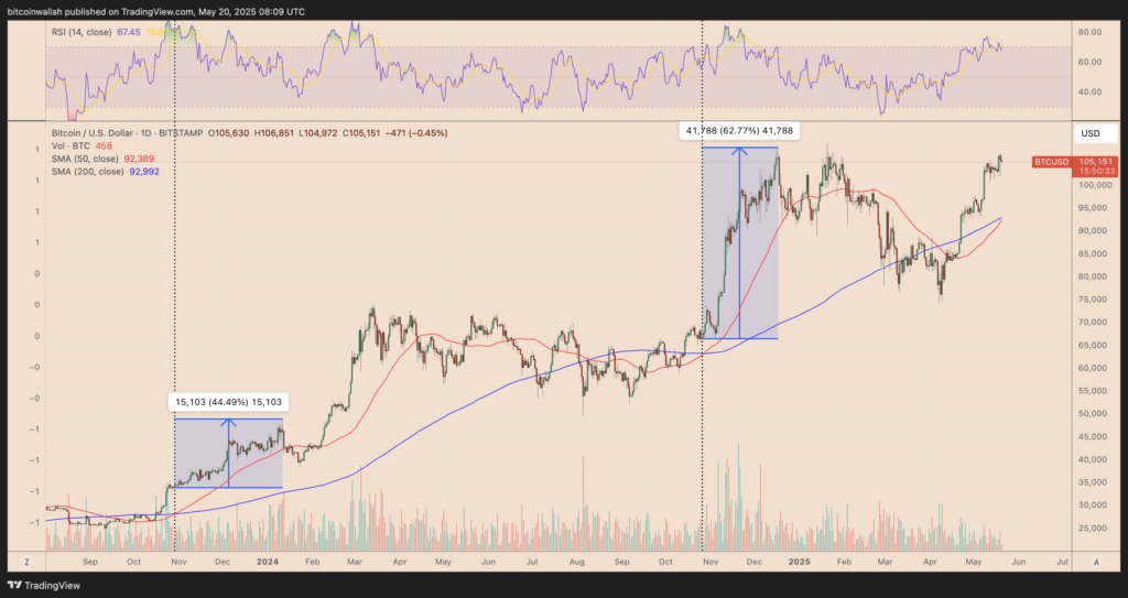 همانطور که گفتیم در گذشته این الگو معمولا با جهشهای چشمگیری همراه بوده است. به عنوان مثال، در اکتبر سال ۲۰۲۳ نیز قیمت بیت کوین پس از تشکیل تقاطع صعودی که به دنبال هیجان پیرامون تایید ETFها شکل گرفته بود، حدود ۴۵٪ رشد کرد. در سپتامبر سال ۲۰۲۱ نیز بیت کوین پس از این الگو با رشدی ۵۰ درصدی همراه شد. جالب اینجاست که پس از پیروزی ترامپ در انتخابات آمریکا نیز تقاطع صعودی در نمودار بیت کوین تشکیل شده بود که به رشد ۶۰ درصدی قیمت منجر شد.