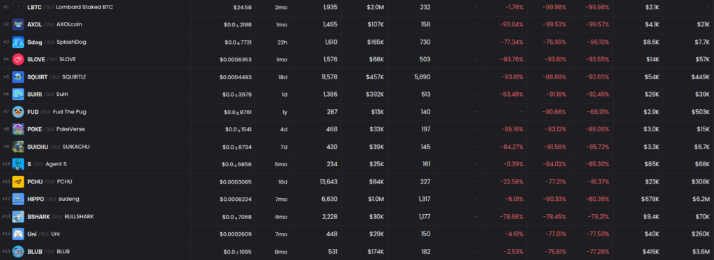 برخی توکنها مانند «لومبارد استیکد بیت کوین» (Lombard Staked BTC یا LBTC) و «اکسول کوین» (AXOLcoin یا AXOL) تقریباً تمام ارزش خود را در Cetus از دست دادهاند. طبق دادههای موجود، ۱۵ توکن برتر سیتوس هرکدام بیش از ۷۵٪ سقوط قیمت را تجربه کردهاند.