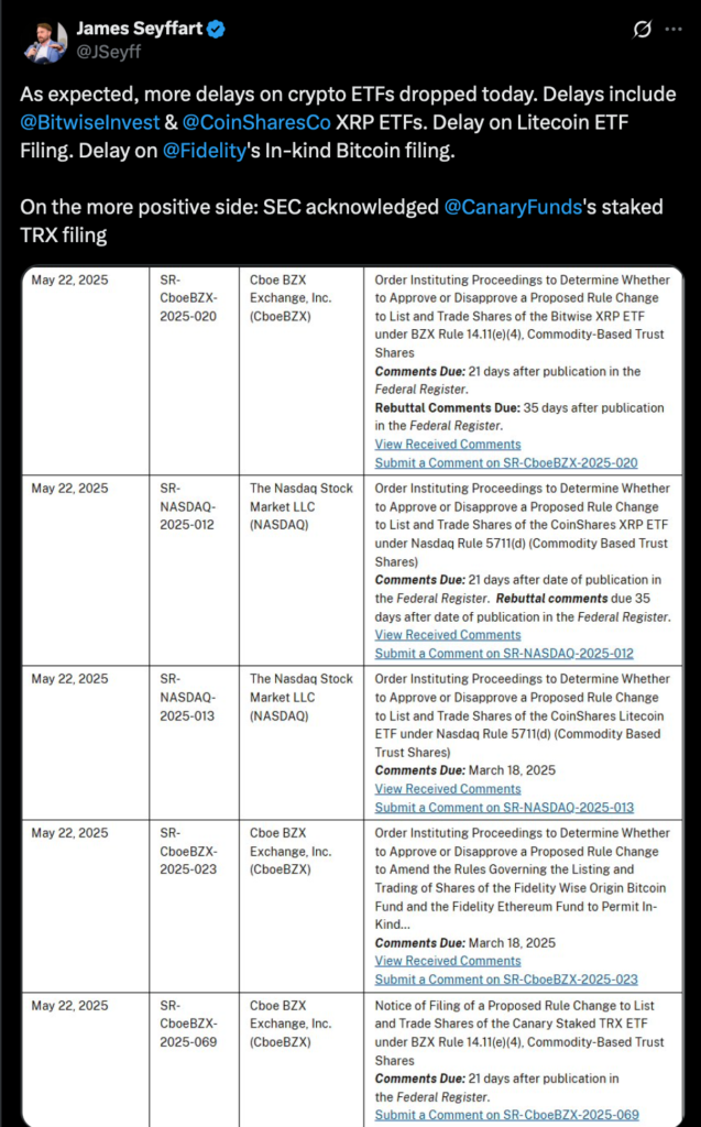 سیفرت همچنین اشاره کرد که امروز، کمیسیون SEC بار دیگر تصمیمگیری درباره ETFهای ریپل، ETF لایت کوین و همچنین درخواست ETF بیت کوین فیدلیتی (Fidelity) را به تعویق انداخته است.