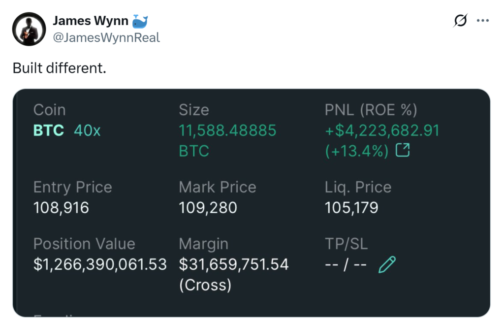 ماجرای پوزیشن میلیارد دلاری لانگ بیت کوین وین به ۲۱ مه برمیگردد. در آن زمان این معاملهگر نخستین پوزیشن خود را با حجم ۸۳۰ میلیون دلار باز کرد و در همان روز ۴۰۰ میلیون دلار به جیب زد. اما تنها یک روز بعد او حجم پوزیشن خودش را به ۱.۱ میلیارد دلار رساند و به اولین معاملهگری تبدیل شد که پوزیشنی میلیارد دلاری در پلتفرم هایپرلیکویید باز میکند. در آن زمان قیمت بیت کوین به تازگی از مرز ۱۱۰ هزار دلاری عبور کرده بود و این معامله برای وین ۳۹ میلیون دلار سود تحقق نیافته به همراه داشت.