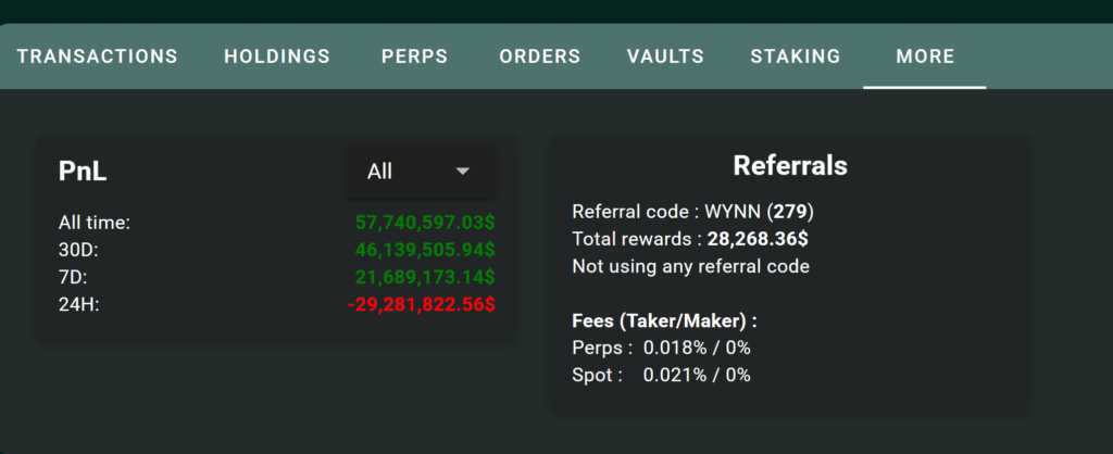 طبق دادههای هایپر اسکن (HypurrScan)، جیمز وین تنها در یک روز گذشته بیش از ۲۹ میلیون دلار زیان متحمل شده است. با این حال، او همچنان در مجموع معاملاتش ۵۷ میلیون دلار سود خالص دارد و تنها در یک ماه گذشته ۴۶ میلیون دلار سود کرده است.