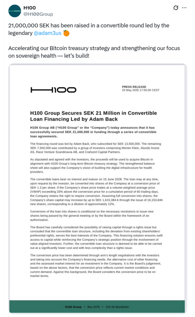 به گزارش میهن بلاکچین، شرکت H100 در تاریخ ۲۵ می (۴ خرداد) اعلام کرد که این سرمایه از طریق وامهای قابلتبدیل بدون بهره تامین شده و مطابق با برنامهای که در ۲۲ می (۱ خرداد) اعلام کرده بود، صرف خرید بیت کوین خواهد شد.