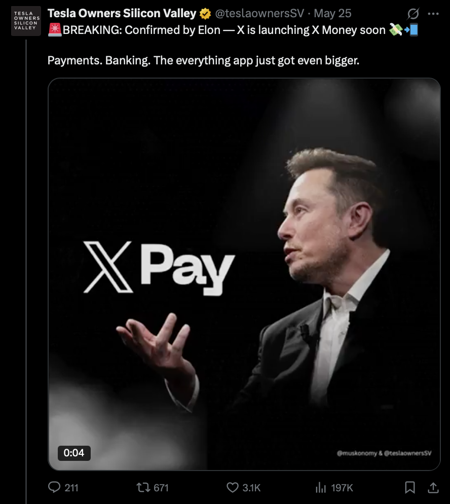 ایلان ماسک، مدیرعامل تسلا (Tesla)، روز یکشنبه تأیید کرد که سرویس پرداخت X در مرحله بتا بهزودی عرضه میشود. او در پاسخ به حساب کاربری Tesla Owners Silicon Valley که نوشته بود: «X بهزودی X Money را راهاندازی میکند»، گفت: