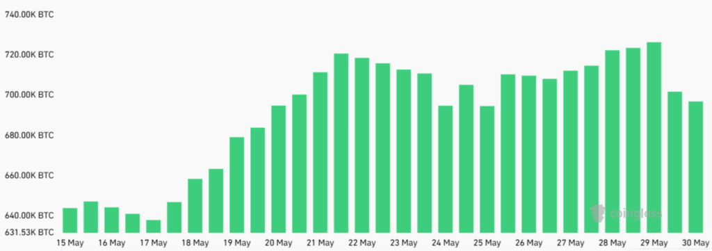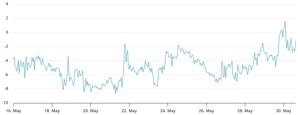 ارزش کل موقعیتهای سود باز (OI) معاملات آتی بیت کوین در تاریخ ۳۰ می (۹ خرداد)، معادل ۷۰۰٬۰۰۰ بیت کوین بود که تنها ۲٪ کمتر از سطح ثبتشده در ۲۷ می (۶ خرداد) است. این موضوع نشان میدهد که اشتهای معاملهگران برای موقعیتهای اهرمی کاهش نیافته است. در واقع، مجموع لیکوئید شدن موقعیتهای صعودی معاملات آتی بیت کوین در طول چهار روز، معادل ۳۲۳ میلیون دلار بود که کمتر از ۰.۵٪ از کل موقعیتهای سود باز محسوب میشود.