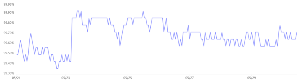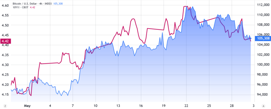بازدهی اوراق خزانه ۱۰ ساله ایالات متحده در تاریخ ۲۲ می (۱ خرداد) به اوج ۴.۶۰٪ رسید، اما از آن زمان تا ۳۰ می (۹ خرداد) به ۴.۴۲٪ کاهش یافته است، چراکه سرمایهگذاران بهدنبال داراییهای امن با پشتوانه دولت بودند. کاهش بازدهی نشان میدهد معاملهگران بازدهی کمتری را پذیرفتهاند که این مسئله بیانگر افزایش فعالیتهای خرید است. این تغییر جهت، همزمان با کاهش ۷٬۹۰۰ دلاری بیت کوین از ۲۲ می تا ۳۰ می اتفاق افتاد.