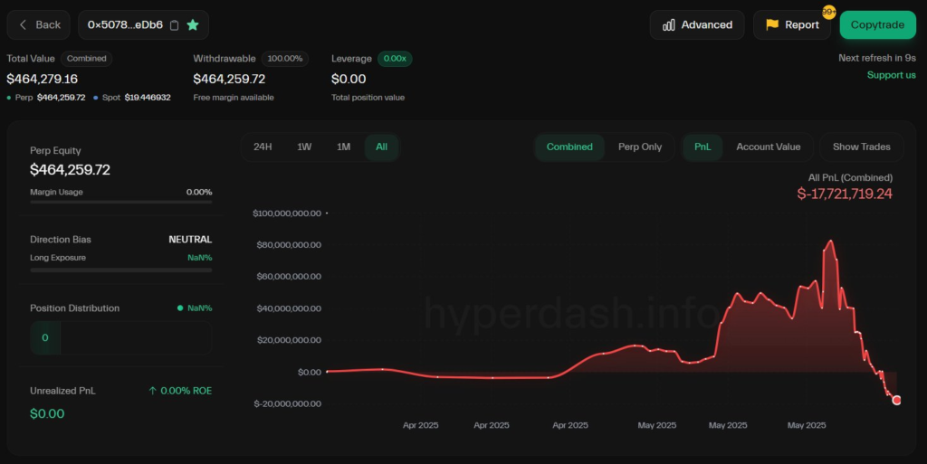 دادههای آنچین نشان میدهد این موقعیتها در تاریخ ۳۰ می (۹ خرداد)، همزمان با اصلاح قیمت بیت کوین به ۱۰۴٬۰۰۰ دلار، پایینترین سطح خود در ۱۰ روز گذشته، به ارزش ۹۹.۳ میلیون دلار لیکوئید شدند. بر اساس گزارش هایپراسکن (Hypurrscan) پلتفرم تحلیلی هایپرلیکوئید، اولین موقعیت معاملاتی به میزان ۵۲۷.۲۹ بیت کوین و به ارزش ۵۵.۳ میلیون دلار، زمانی که قیمت بیت کوین به ۱۰۴٬۹۵۰ دلار رسید، لیکوئید شد. دومین موقعیت نیز به میزان ۴۲۱.۸ بیت کوین و به ارزش ۴۳.۹ میلیون دلار، پس از ریزش قیمت بیت کوین به ۱۰۴٬۱۵۰ دلار بسته شد.