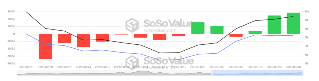 بر اساس دادههای منتشرشده از سوی وبسایت سوسو ولیو (SosoValue)، صندوقهای ETF وابسته به اتریوم از تاریخ ۱۶ می (۲۷ اردیبهشت) تاکنون با افزایش ورود سرمایه مواجه بودهاند. فقط در هفته گذشته، این صندوقها بهطور خالص ۲۸۶ میلیون دلار جذب سرمایه داشتهاند. این موضوع نشانهای از افزایش اعتماد نهادهای مالی به اتریوم است.