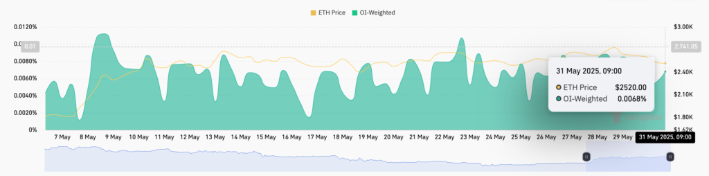 یکی دیگر از عوامل تأییدکننده روند صعودی، نرخ مثبت فاندینگ ریت اتریوم است. این نرخ نشان میدهد معاملهگران دارای پوزیشن خرید (لانگ) حاضرند برای حفظ موقعیت خود هزینه بپردازند. در حال حاضر، فاندینگ ریت ETH برابر با ۰.۰۰۶۸٪ است.