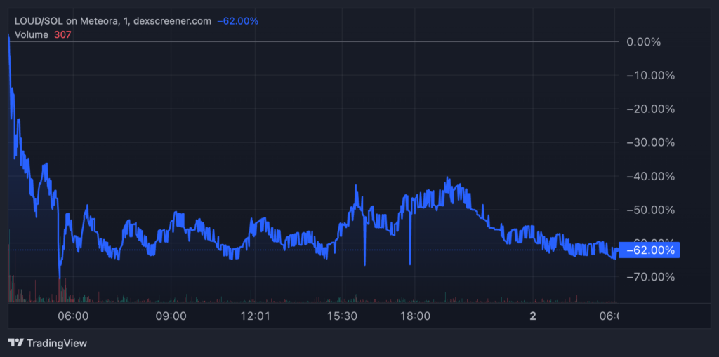 طبق دادههای وبسایت دکس اسکرینر (DexScreener)، قیمت اولیه توکن LOUD معادل ۰.۰۰۰۳ دلار بود و خیلی زود به سقف تاریخی ۰.۰۳۲ دلار رسید؛ اما بعد از آن وارد روند نزولی شد. در مجموع قیمت این توکن تاکنون ۶۲٪ افت کرده و در زمان نگارش این مطلب، قیمت آن به ۰.۰۰۹ دلار رسیده است.