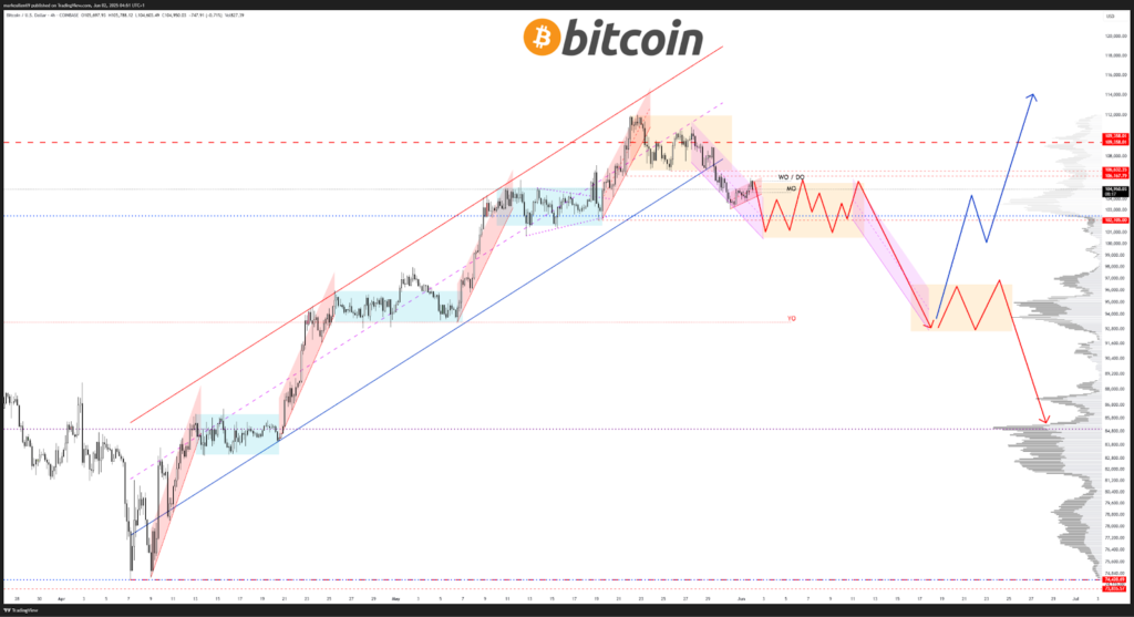 از دیدگاه تحلیلگری با نام دان کریپتو تریدز (Daan Crypto Trades)، دو سطح بسیار مهم در هفته اول ژوئن وجود دارد، محدوده میانی در محدوده ۹۹,۶۰۰ دلار و سقف قبلی که در محدوده ۱۰۸,۰۰۰ دلار قرار دارد. او در تاریخ ۱ (۱۱ تیر) ژوئن توییتی منتشر کرد و گفت: