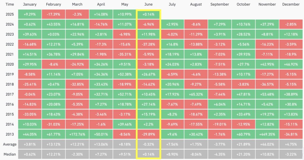 با وجود اینکه قیمت بیت کوین در ماه می ۱۱٪ افزایش یافته است، معاملهگران اکنون نمیدانند جهت حرکت بعدی قیمت چه خواهد بود. ماه ژوئن در گذشته نتایجی متنوع و نامطمئن داشته است و میانگین عملکرد آن با ۰.۳٪ کاهش همراه بوده است.