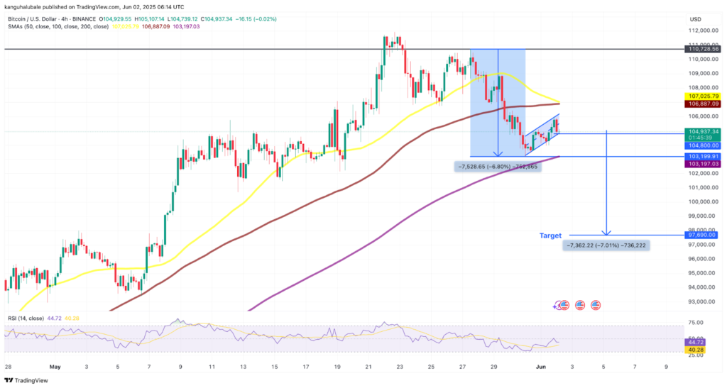 اگر قیمت به مرز پایینی این پرچم (در سطح ۱۰۴٬۸۰۰ دلار) کاهش یابد، این اتفاق تأیید میکند که روند نزولی ادامه پیدا خواهد کرد. هدف قیمتی که از این الگو بهدست میآید، حدود ۹۷٬۶۹۰ دلار است. این عدد از طریق اضافهکردن ارتفاع میله پرچم به نقطه شکست محاسبه شده است.