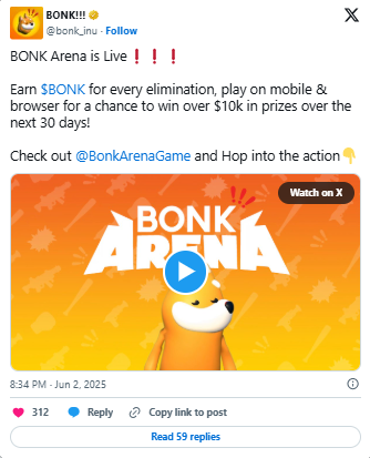 میم کوین بونک که بر بستر شبکه سولانا فعالیت میکند از بازی جدید خود به نام بونک آرنا (Bonk Arena) رونمایی کرد. این بازی که توسط استودیوی براوو ردی (Bravo Ready) توسعه یافته، اولین بازی رسمی و دارای مجوز این میمکوین محبوب است. این استودیو پیشتر بازی معروف BR1: Infinite را روی سولانا توسعه داده بود.