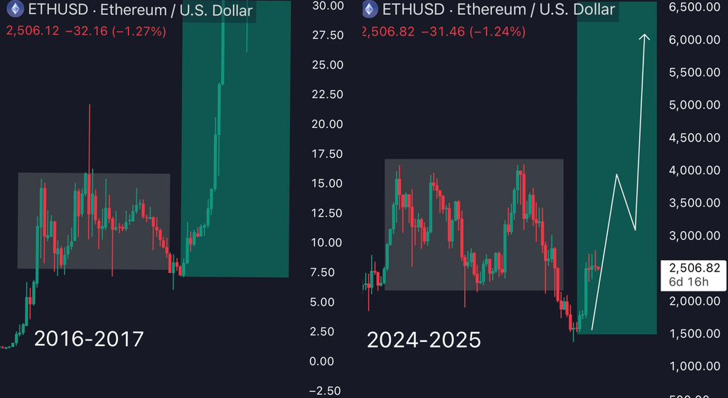 الگوی فعلی هم همین مسیر را نشان میدهد. قیمت اتریوم بین ۱,۶۰۰ تا ۴,۰۰۰ دلار نوسان کرده و سپس افت تندی را تجربه کرد و حالا دوباره در حال صعود بهسمت محدوده احتمالی شکست در ۳,۵۰۰ تا ۴,۰۰۰ دلار است.