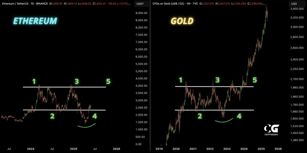 به گزارش میهن بلاکچین، الگوی رفتاری چندسالهای در نمودار قیمت طلا، از احتمال جهش قیمت خرید اتریوم تا ۶,۰۰۰ دلار در ماههای آینده حمایت میکند. مقایسه نمودار قیمت اتریوم و طلا، نشان میدهد ETH در حال تکرار ساختار انباشت چندساله طلا از سال ۲۰۱۹ تا ۲۰۲۴ است.