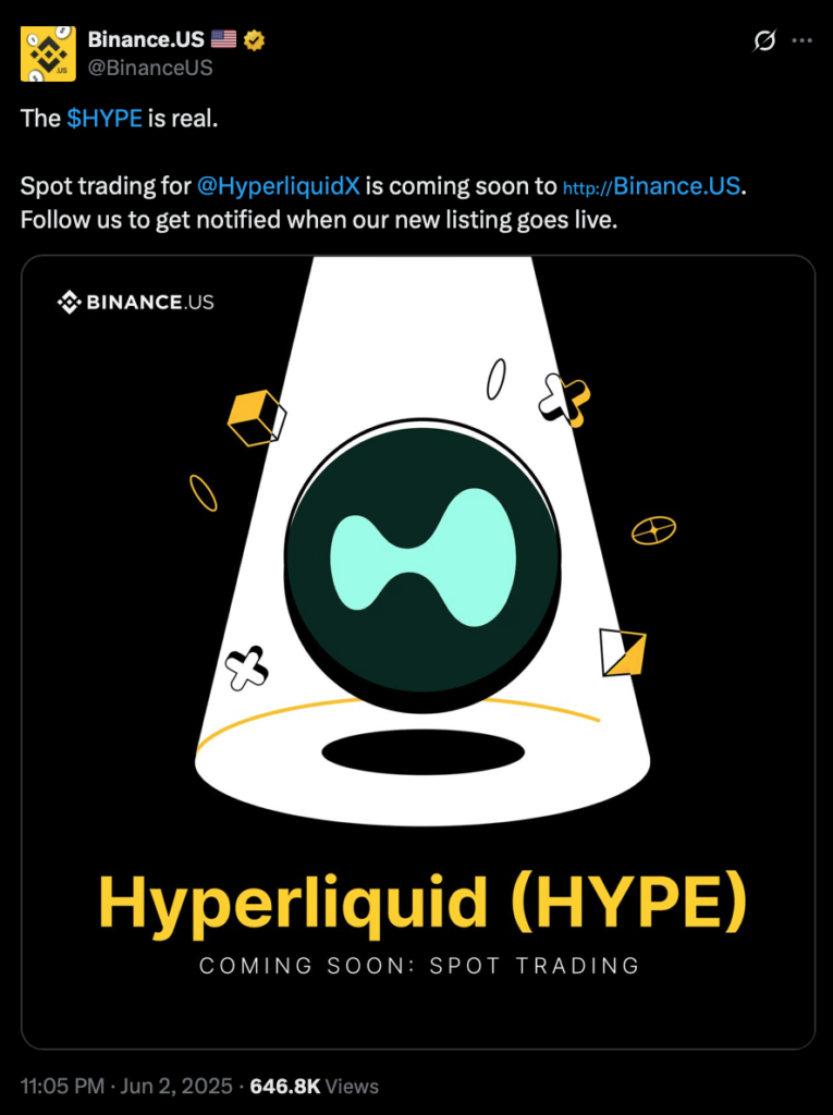 پلتفرم Hyperliquid اخیرا بهدلیل معاملات بزرگ لانگ و شورت توسط نهنگی به نام جیمز وین (James Wynn) توجه زیادی را جلب کرده است. معاملات این فرد باعث شد حجم معاملات روزانه هایپرلیکویید در هفته گذشته به ۸.۶ میلیارد دلار برسد. روز گذشته، Binance US اعلام کرد که توکن این پروژه را لیست میکند و این اتفاق، موفقیت بزرگ دیگری برای این پلتفرم محسوب میشود.