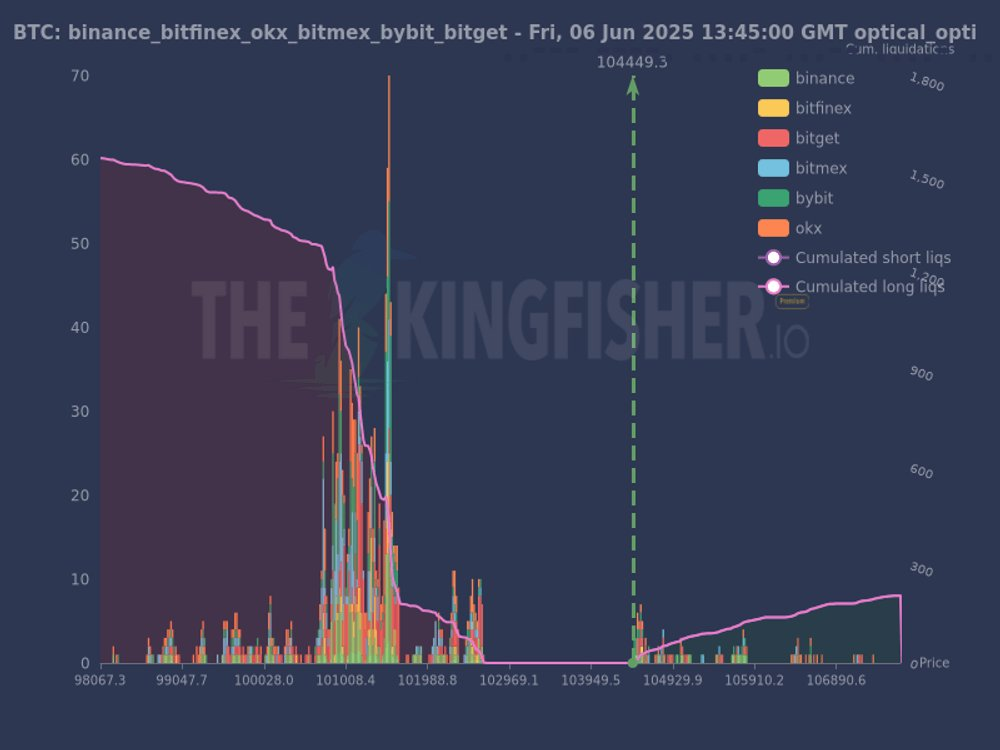 این ناحیه، منطقه مغناطیسی بزرگ در زیر قیمت فعلی بهحساب میآید. در مقابل، لیکوئیدیشنهای موقعیت شورت در بالای محدوده حدود ۱۰۴٬۵۰۰ دلار بسیار اندک هستند.