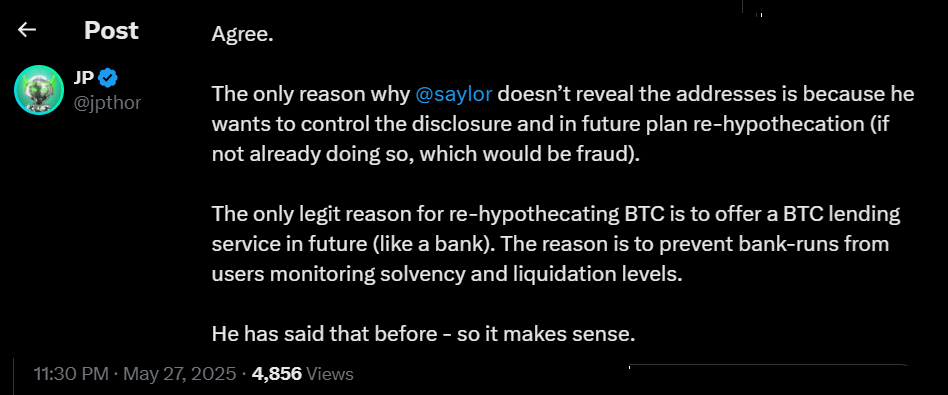 شفافیت نداشتن مذکور باعث شد گمانهزنیها در مورد احتمال استفاده چندباره از وثیقه بیت کوین (Re-hypothecation) توسط برخی متولیان مالی، یعنی استفاده از یک دارایی بهعنوان وثیقه برای چند تعهد مالی مختلف دوباره قوت بگیرد.