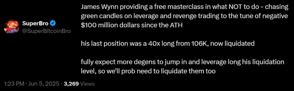 برخی تحلیلگران، از جمله کاربر X با نام سوپر بیت کوین برو (SuperBitcoinBro)، معتقدند که افت قیمت بیت کوین تا سطح ۱۰۰٬۴۳۰ دلار در تاریخ ۵ ژوئن عمدتاً ناشی از استفاده بیشازحد از اهرمهای صعودی توسط معاملهگران پرریسک (اصطلاحاً Degenerate Traders) بوده است. این موقعیتهای اهرمی پس از لیکوئید شدن پوزیشن بزرگ متعلق به نهنگ معروف پلتفرم هایپرلیکوئید (Hyperliquid) در نزدیکی سطح ۱۰۴٬۰۰۰ دلار شکل گرفتند.