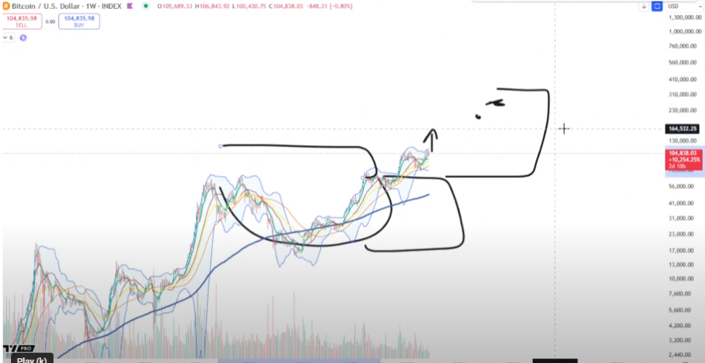 چدز گفت که بیت کوین در نمودار هفتگی وضعیت خوبی دارد. دلیلش هم این است که قیمت از یک الگوی «فنجان و دسته»، شکستی صعودی داشته است؛ این الگو در تحلیل تکنیکال، ساختاری صعودی است؛ به این معنا که وقتی قیمت دارایی مدتی در حالت تثبیت بوده، آماده است که دوباره روند صعودی خودش را ادامه بدهد.